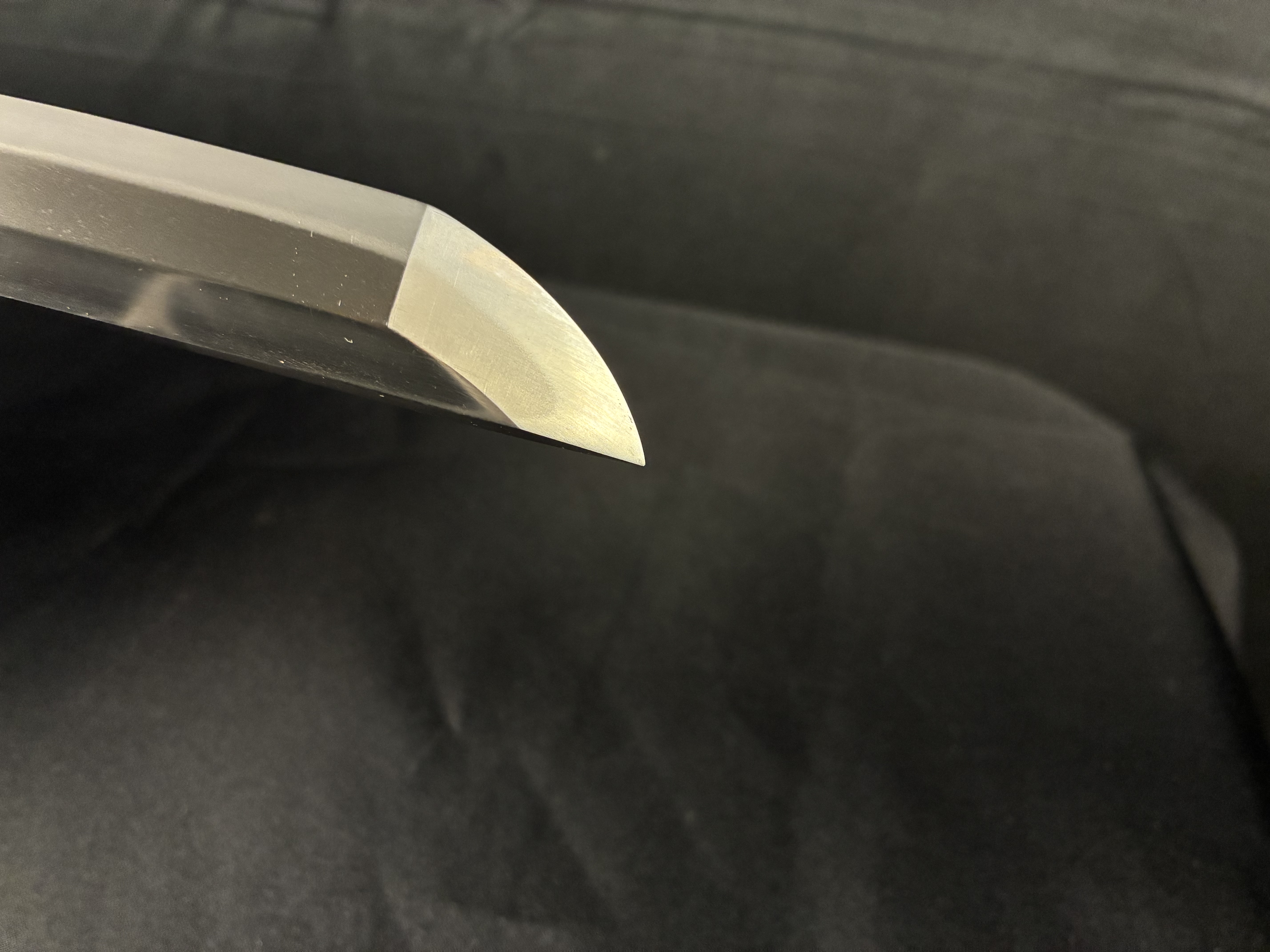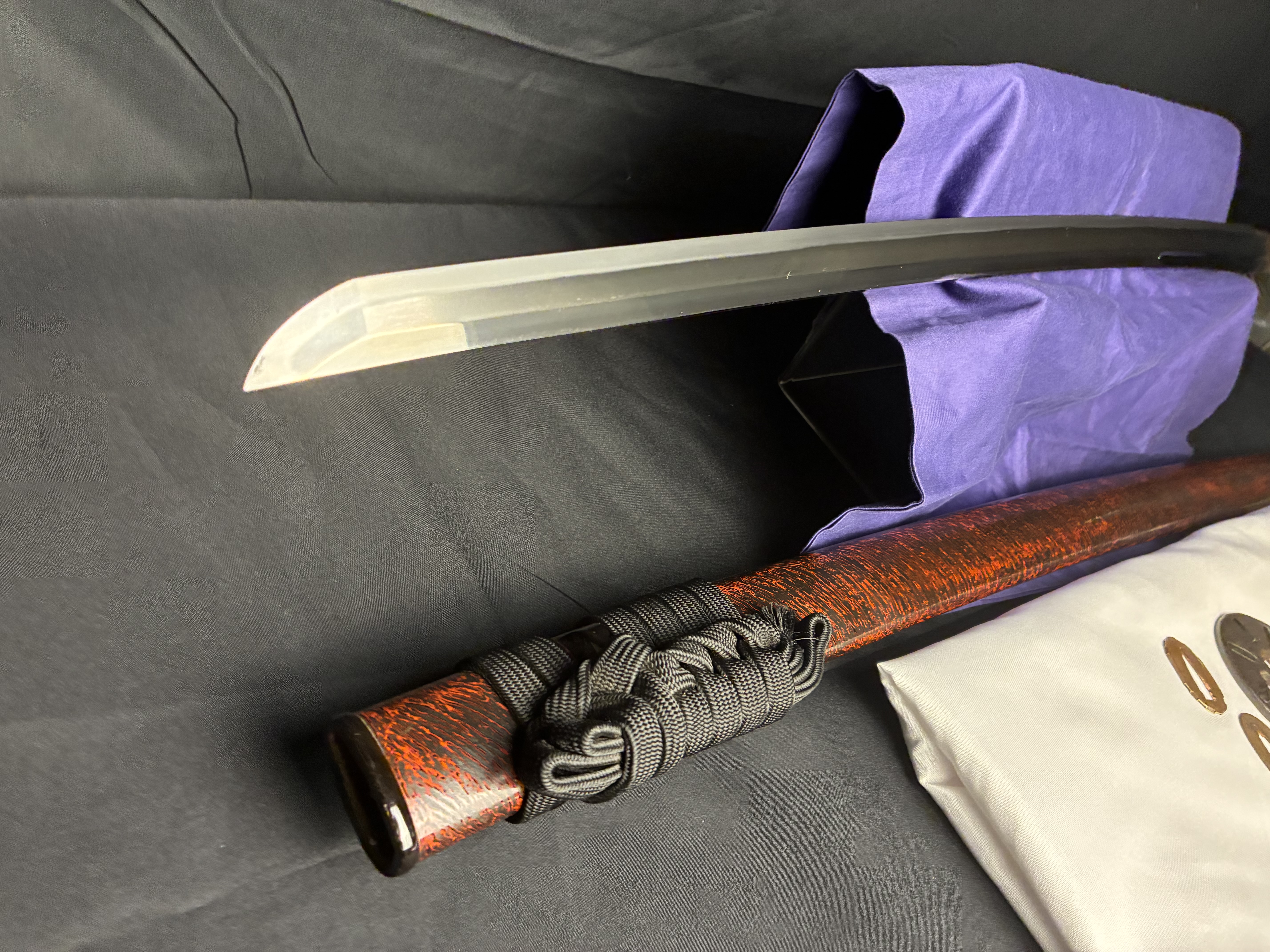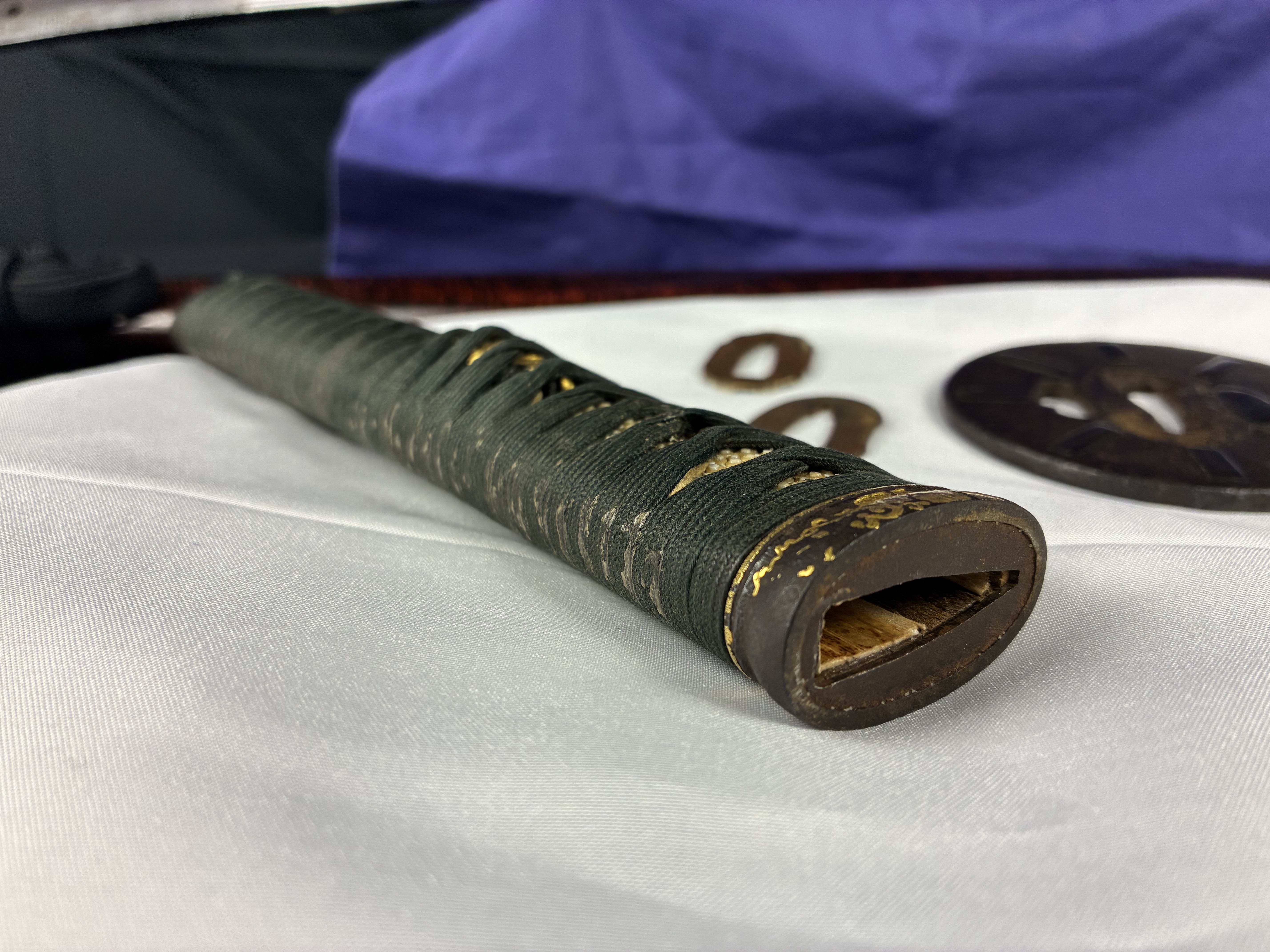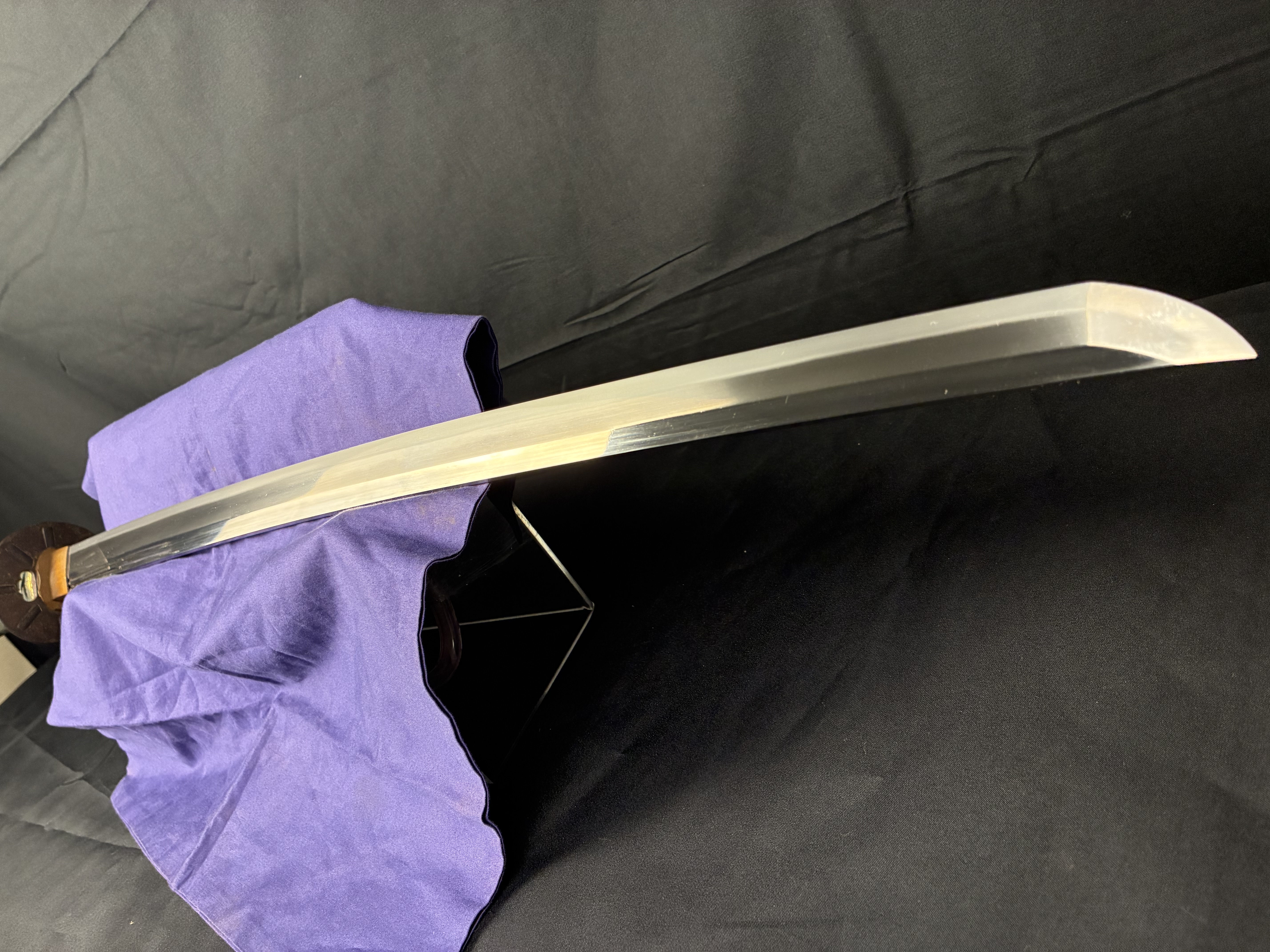 本刀の豊後住山城大掾(以下切れ)は推定ではありますが豊後住山城大掾藤原義行刀匠は江戸時代寛文頃(1661年)(360年前)豊後(大分県)の名工です。時代的には江戸の虎鉄と同時代の刀です。姿は元身幅やや広く先身幅の差の有る反りの浅い剣道の突きが流行った時代の所謂虎鉄と同じ姿の寛文新刀姿を現しています。