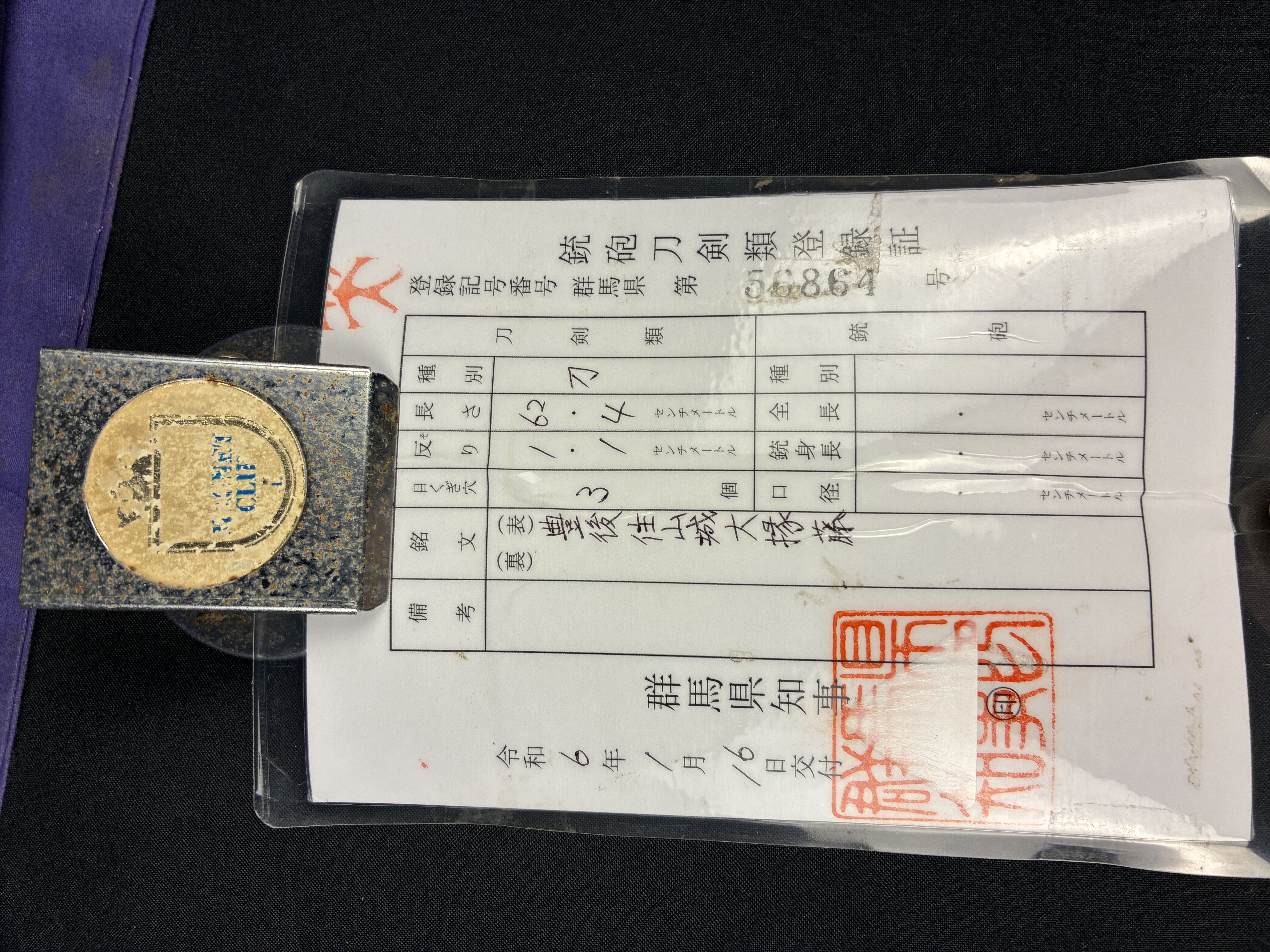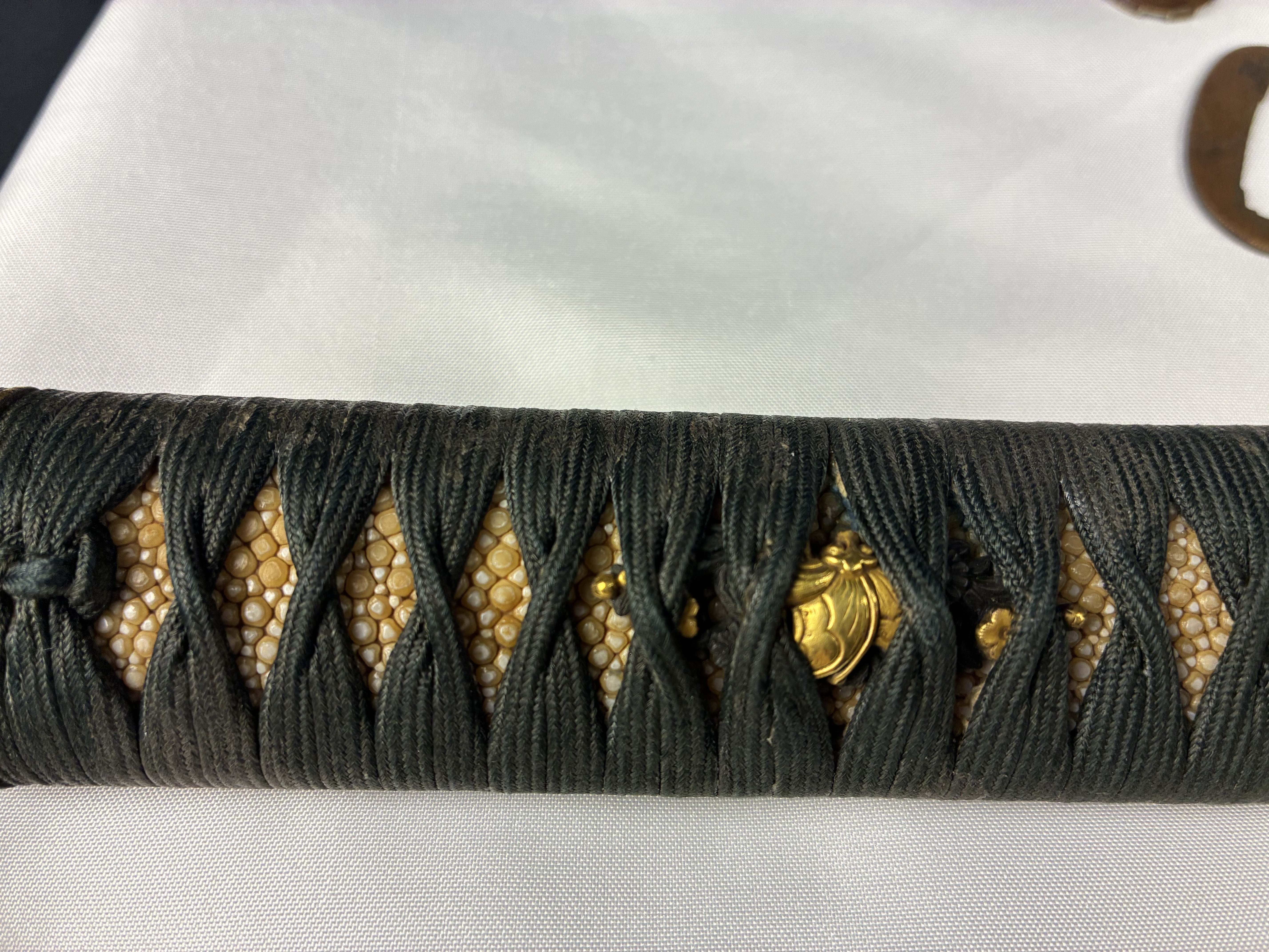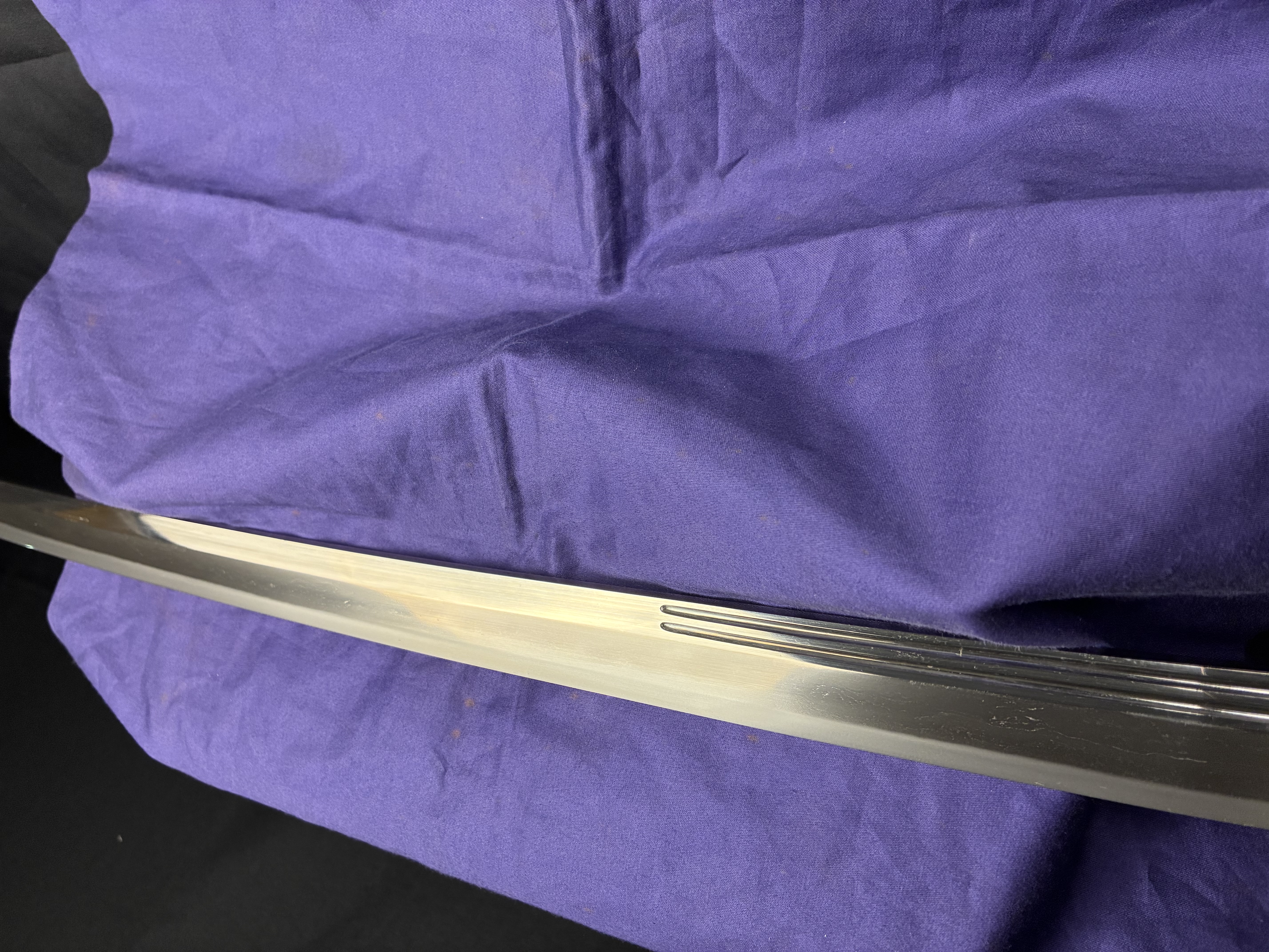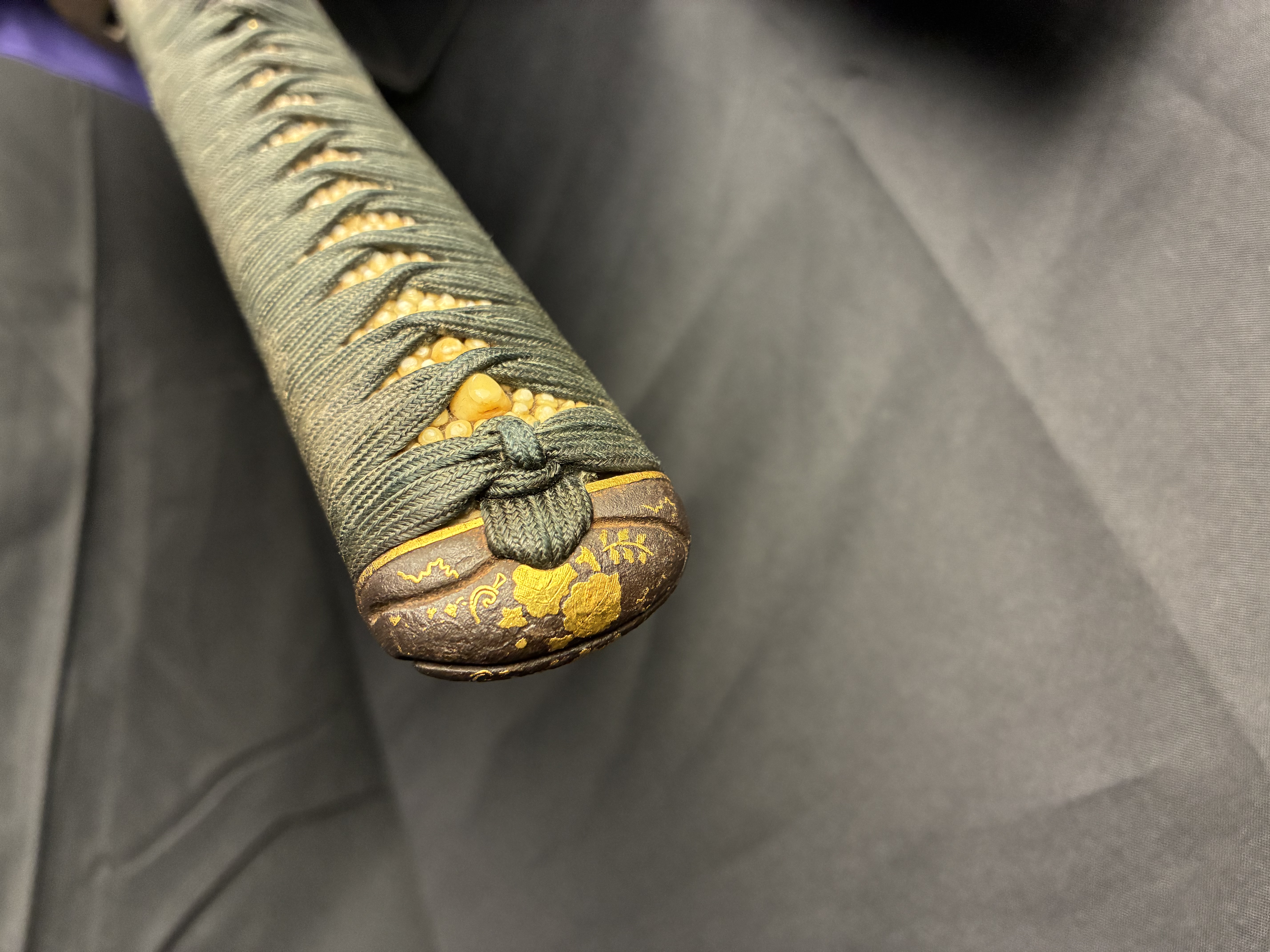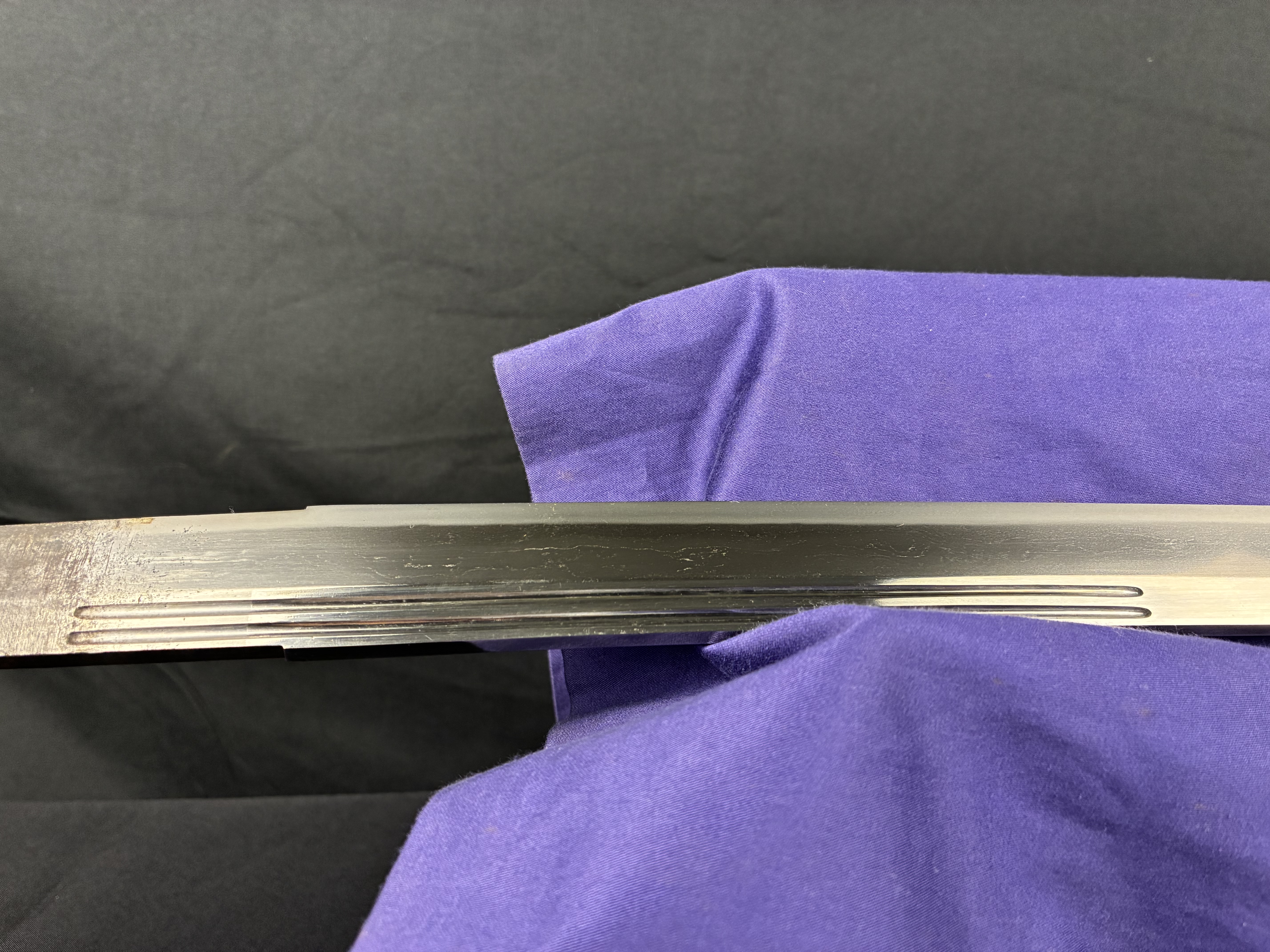本刀の豊後住山城大掾(以下切れ)は推定ではありますが豊後住山城大掾藤原義行刀匠は江戸時代寛文頃(1661年)(360年前)豊後(大分県)の名工です。時代的には江戸の虎鉄と同時代の刀です。姿は元身幅やや広く先身幅の差の有る反りの浅い剣道の突きが流行った時代の所謂虎鉄と同じ姿の寛文新刀姿を現しています。